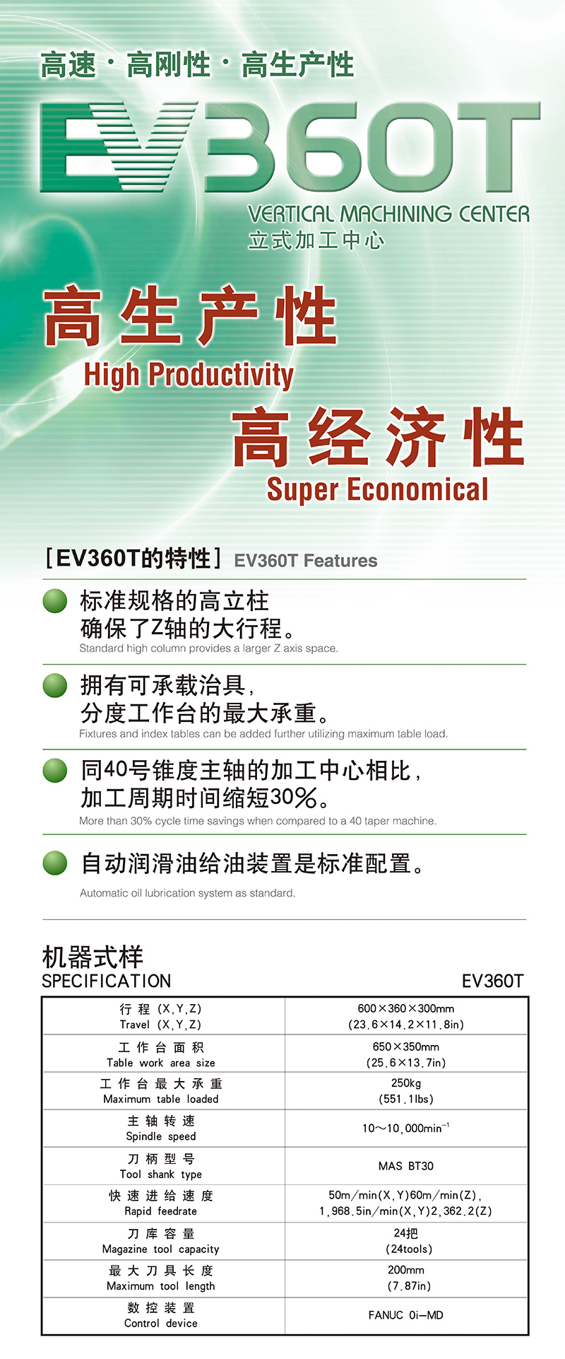 EV360T是远洲品牌的一款高速、高钢性、高生产性的立式加工中心,结构紧凑,功能强劲;为同时对速度和精度有较高要求的应用而设计制造。EV360T采用符合最高标准的工业灰铸铁制造,性能稳定可靠。全数字化控制,X、Y和Z轴快速移动速率高达36m/min,加速度高达4.8 m/sec²,能为您的加工应用提供快速而精确的响应。