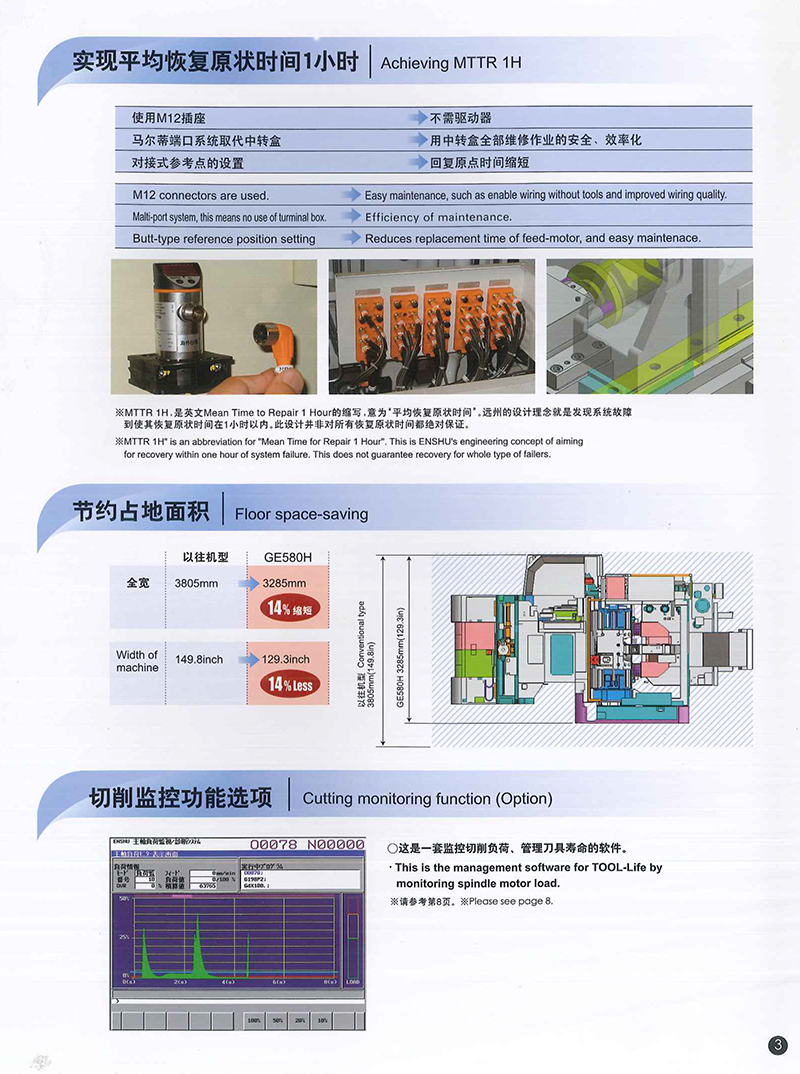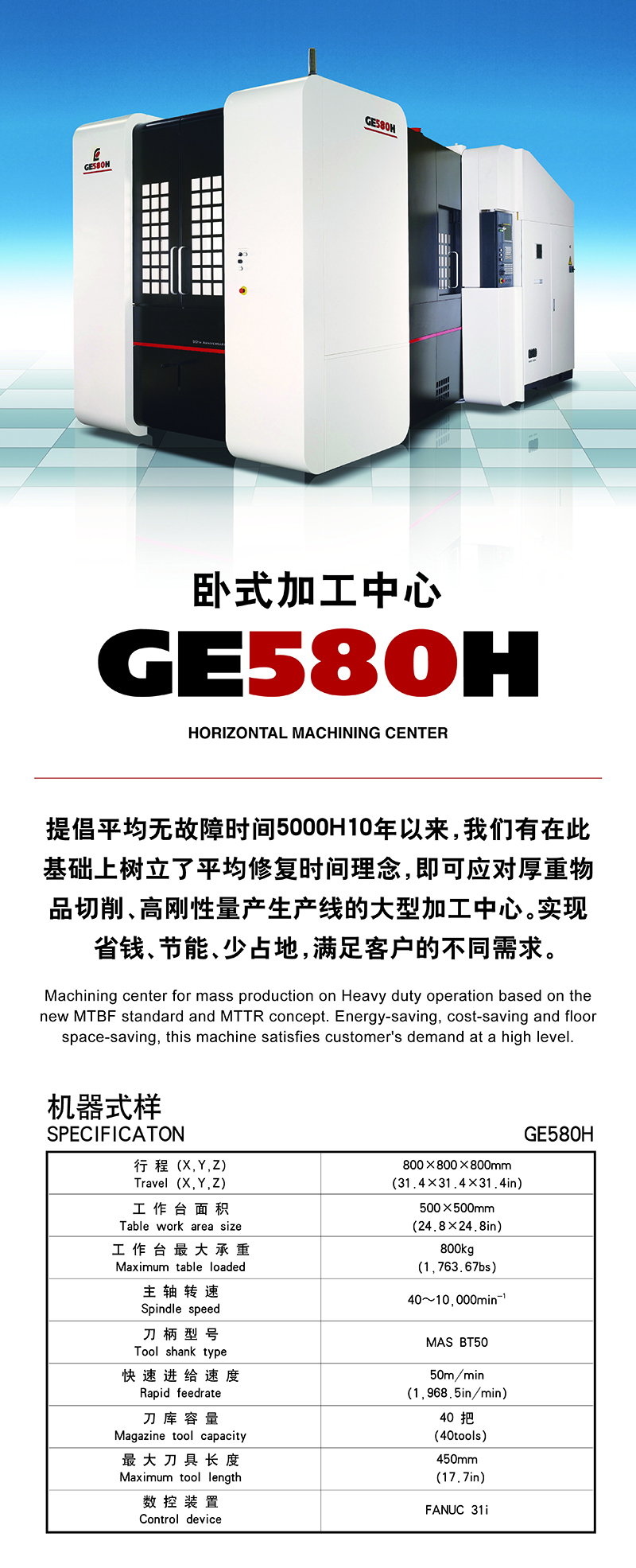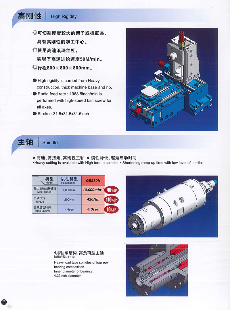 日本远洲GE580H卧式加工中心特征:可进行强力切削的高速·高刚性卧式加工中心;高速和高刚性性能高度成熟;采用了新型立柱使刚性更强;各轴800mm的超大行程。